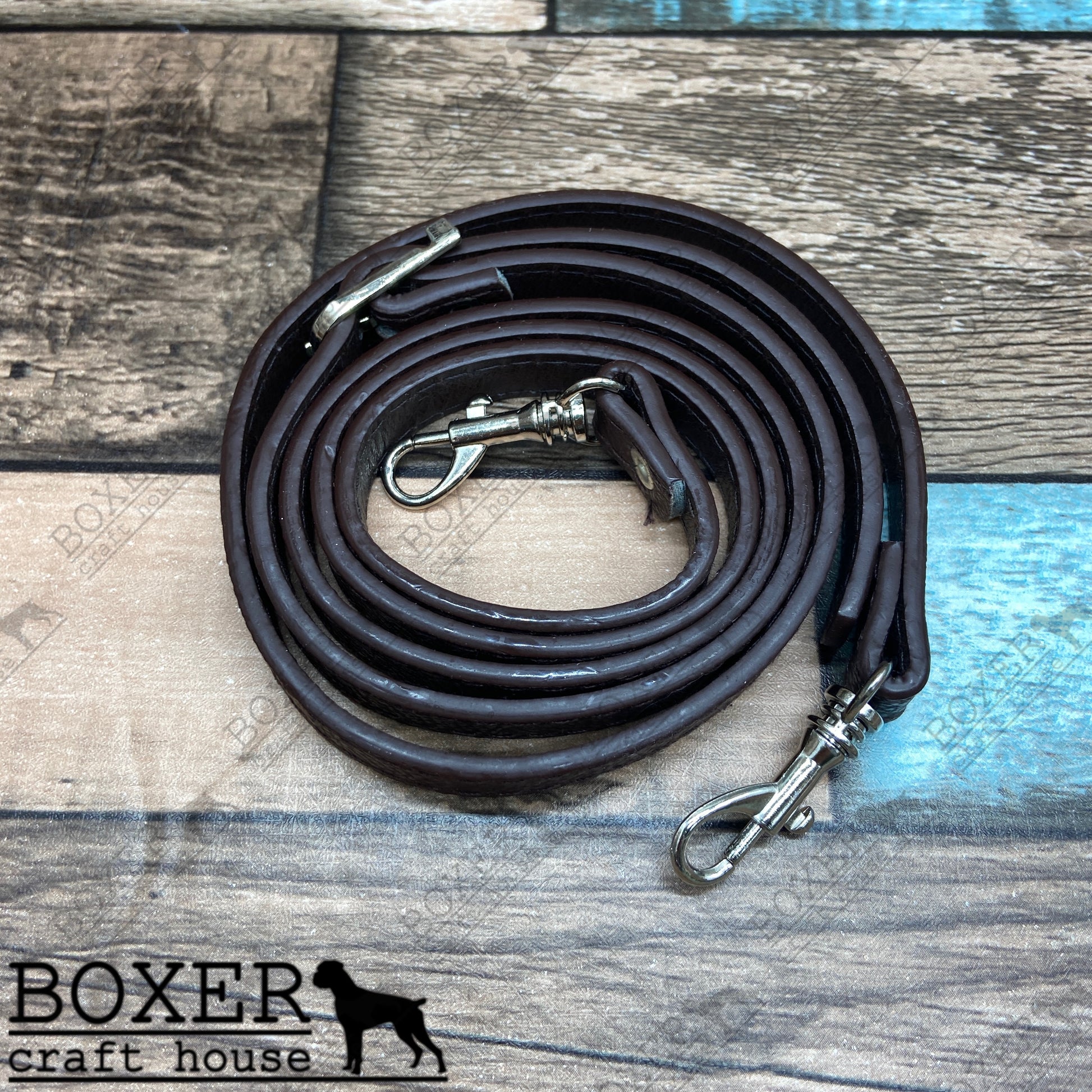 Adjustable faux leather strap, includes five holes for adjusting the length of each strap from 43 inches all the way to 47.5 inches.