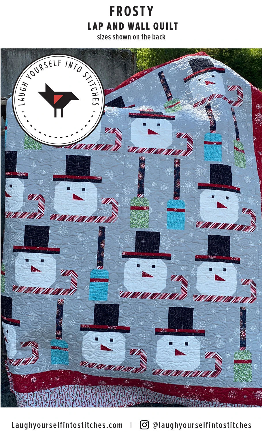 Frosty will melt your heart! A red stripe fabric printed on the diagonal creates an easy candy cane scarf! The nose is a half rectangle triangle (hrt) block and is so fun to make. Pattern offers clear diagrams with an additional online tutorial for the HRT, making this a perfect teaching opportunity! Pattern offers two sizes, Wall Hanging measures 54" x 54" and Lap quilt measuring 66" x 78".