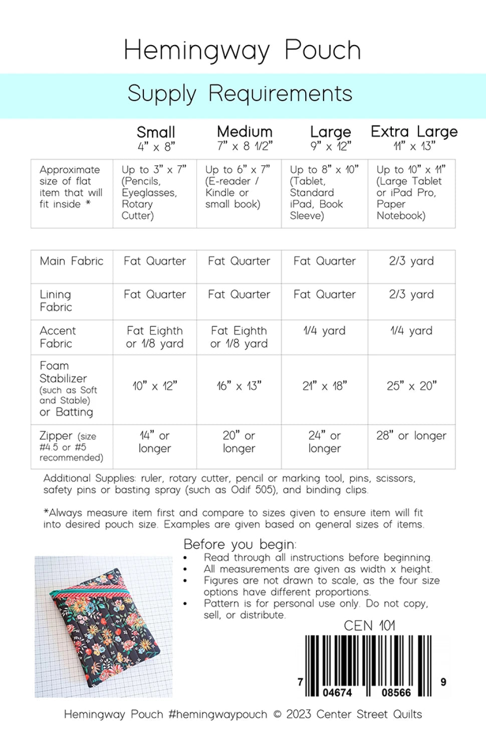 The Hemingway Pouch is a quilted pouch with a unique, diagonal zipper. The four size options included can store and protect your favorite items: eyeglasses, writing utensils, e-reader/Kindle, books, Tablet/iPad, iPad Pro, small laptop, and paper notebook. The pattern includes full color, step-by-step graphics walking the reader through every step.