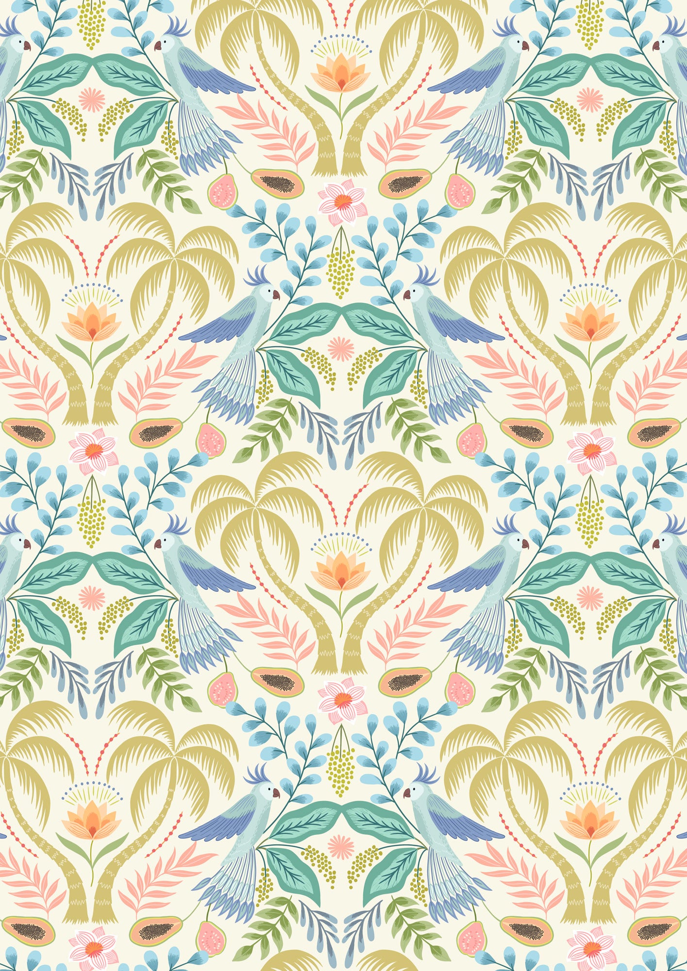 That sunshiny place might look a lot like the fabrics in this collection! Colourful birds, luscious fruits and palm trees swaying in a gentle breeze. The colours remind us of travels to tropical destinations and dreams of an easy going, island life.