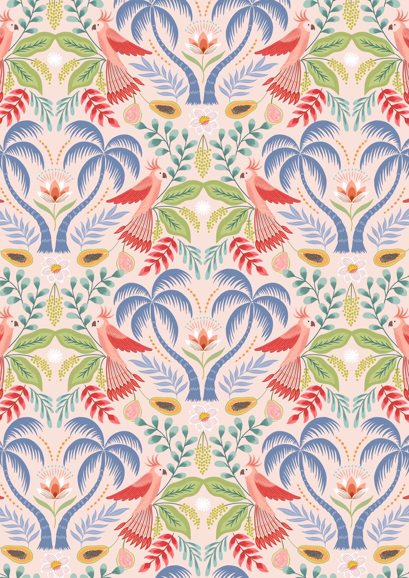 That sunshiny place might look a lot like the fabrics in this collection! Colourful birds, luscious fruits and palm trees swaying in a gentle breeze. The colours remind us of travels to tropical destinations and dreams of an easy going, island life.