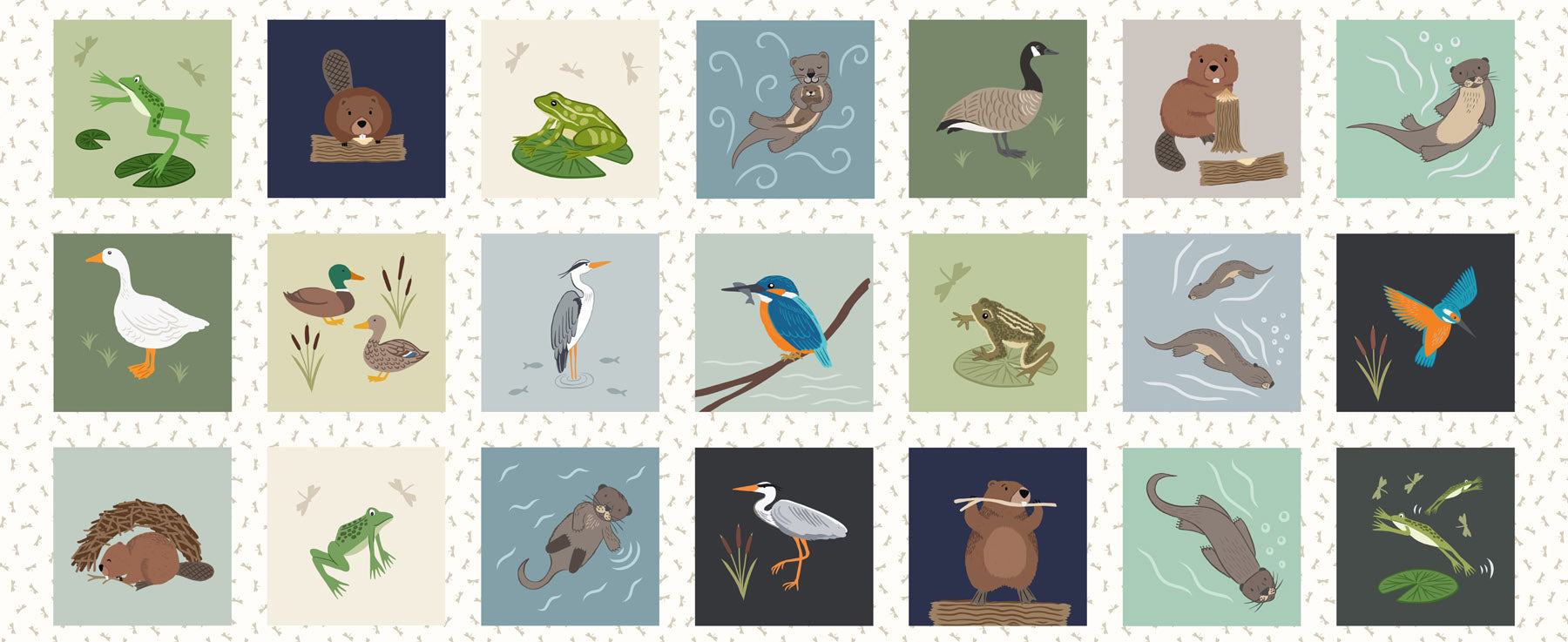 Cute otters and beavers, heron and kingfishers, frogs, ducks and geese all feature in in our river inspired coloured fabric.